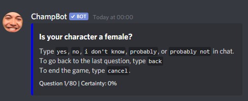 Choose any person, real or fictional, living or dead. Be amazed as ChampBot can guess your character in the matter of a few questions.