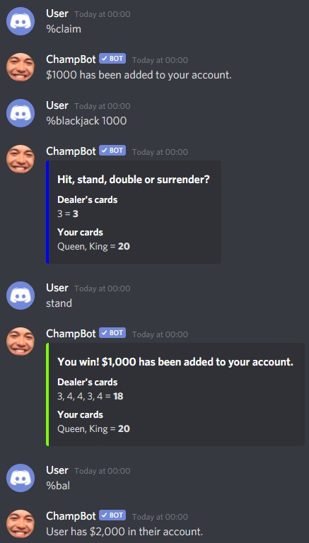 ChampBot features a full-fledged economy system. You can use ingame currency to bet on casino games, such as: